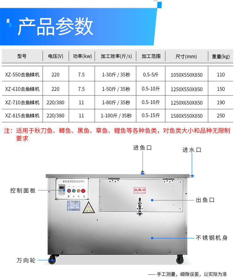| 型號(hào) | XZ-550去魚(yú)鱗機(jī) | XZ-610去魚(yú)鱗機(jī) | XZ-710去魚(yú)鱗機(jī) | XZ-815去魚(yú)鱗機(jī) |