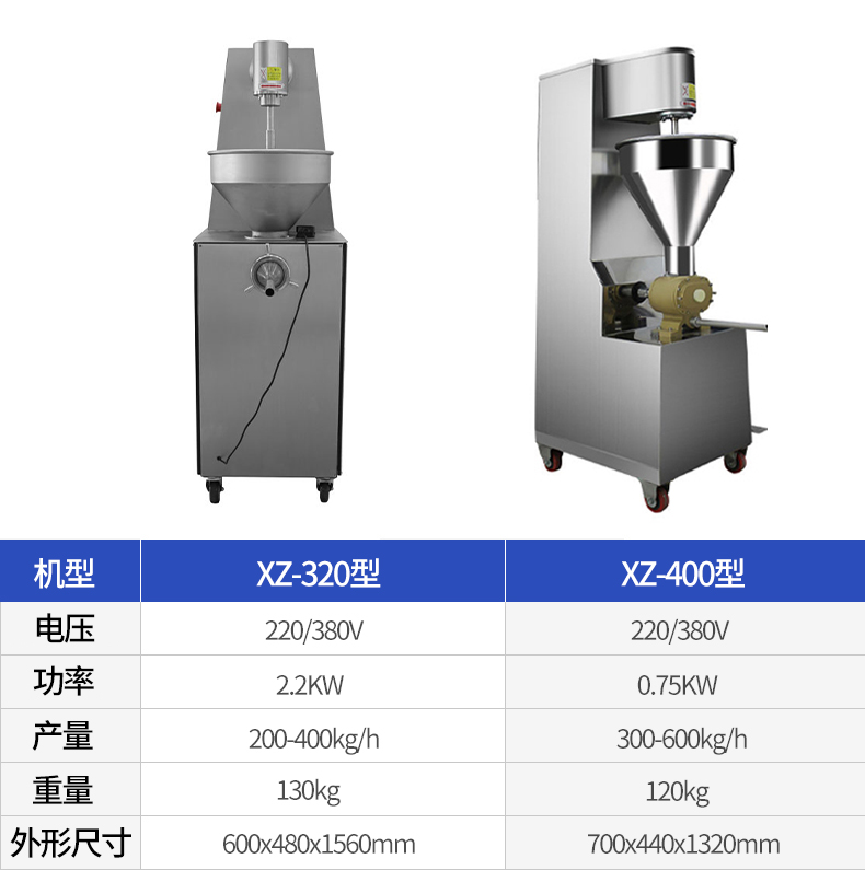 新款XZ-320不銹鋼灌腸機,為XZ-200型和XZ-300型灌腸機的升級產品,優勢在于絞龍出料部縮短、絞龍加大,對肉片、肉顆粒的損傷更小,肉片完整性更高,出料更快。
